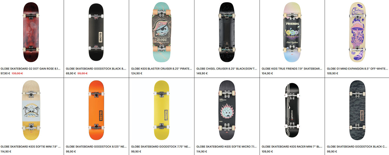 | Modèle | Largeur / usage recommandé | Atouts principaux | | ------------------------- | ---------------------------- | ------------------------------------------------------------------------ | | Globe G1 Supercolor 8.125 | Street / Park | Bois Resin‑7 + trucks Tensor, board prête à rouler, très bon pop. Montaz | | Globe Goodstock 8 FU | Polyvalent pour tous niveaux | Shape classique, roues 52mm, très bon mix entre prix & qualité. Montaz | | Globe Rapid Space 8.25 | Street / Urbain | Roues dures, bon concave, bon contrôle. skatedeluxe Skateshop |